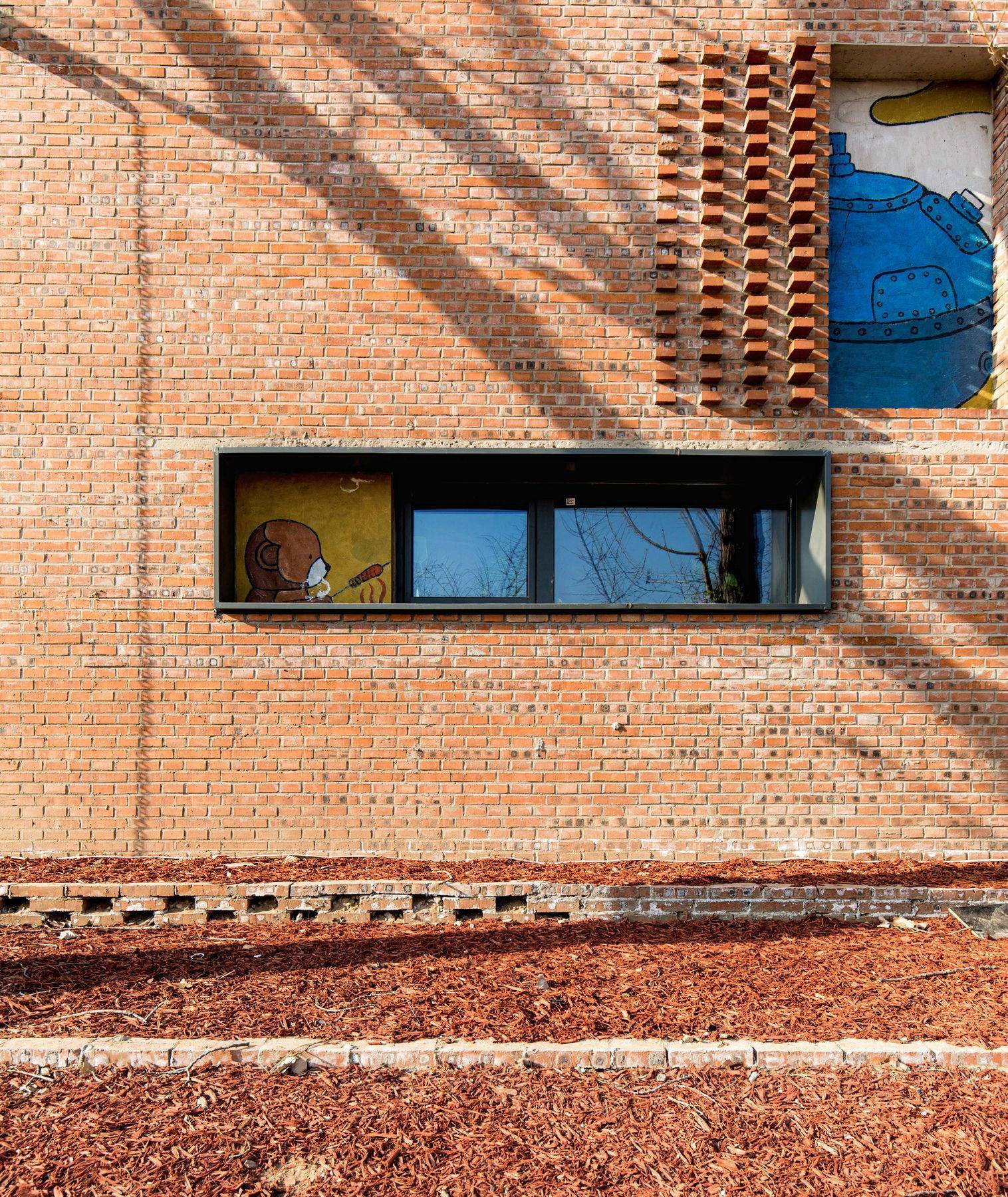 围墙上用拆除的旧窗做出了LOGO